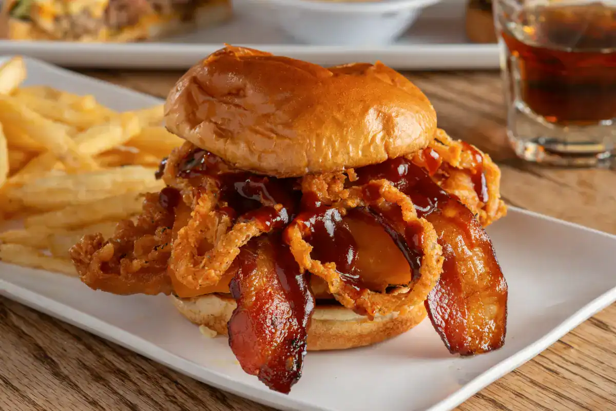 Creamy macaroni and cheese and topped brisket burnt ends, barbeque sauce, crispy fried haystack onions and fresh green onions.